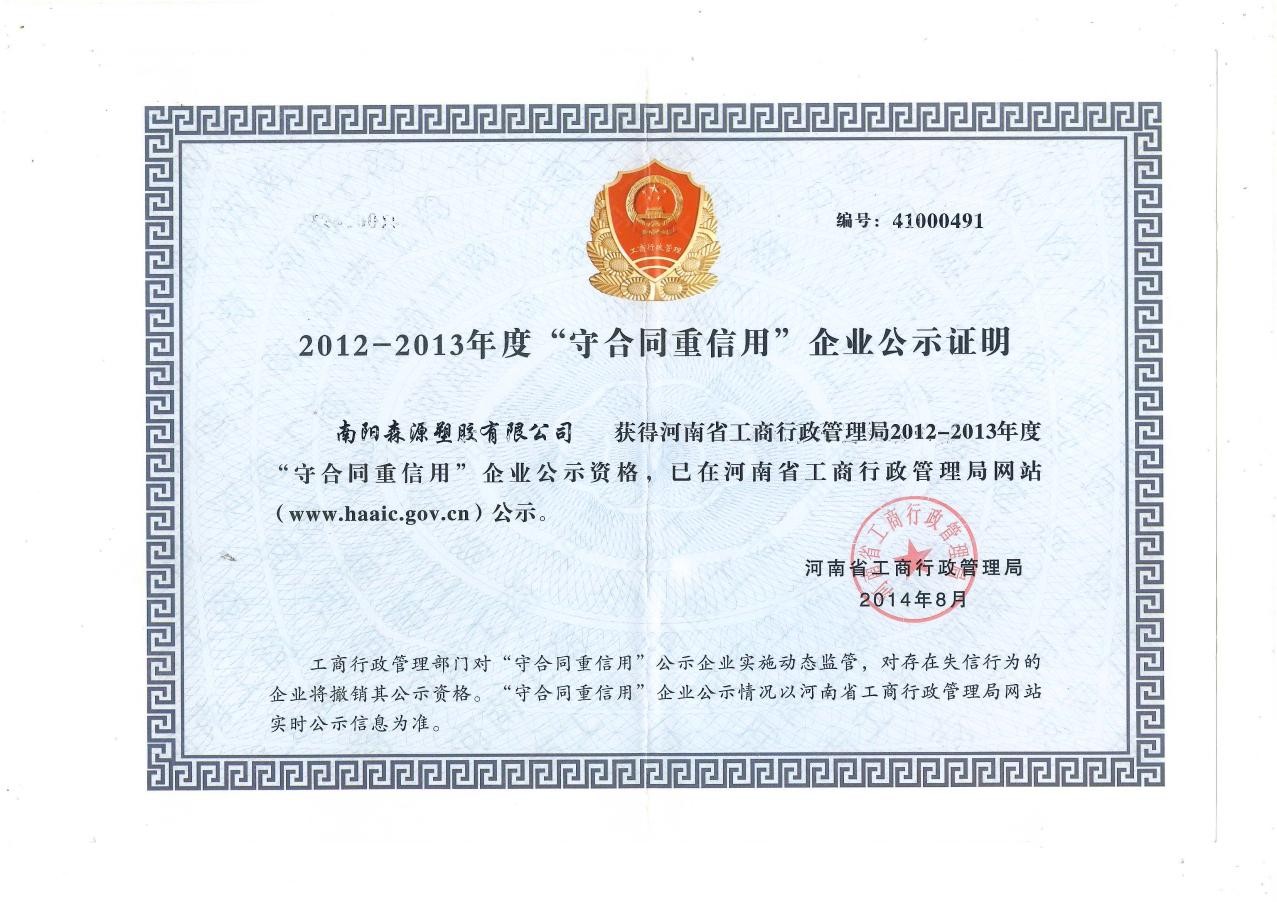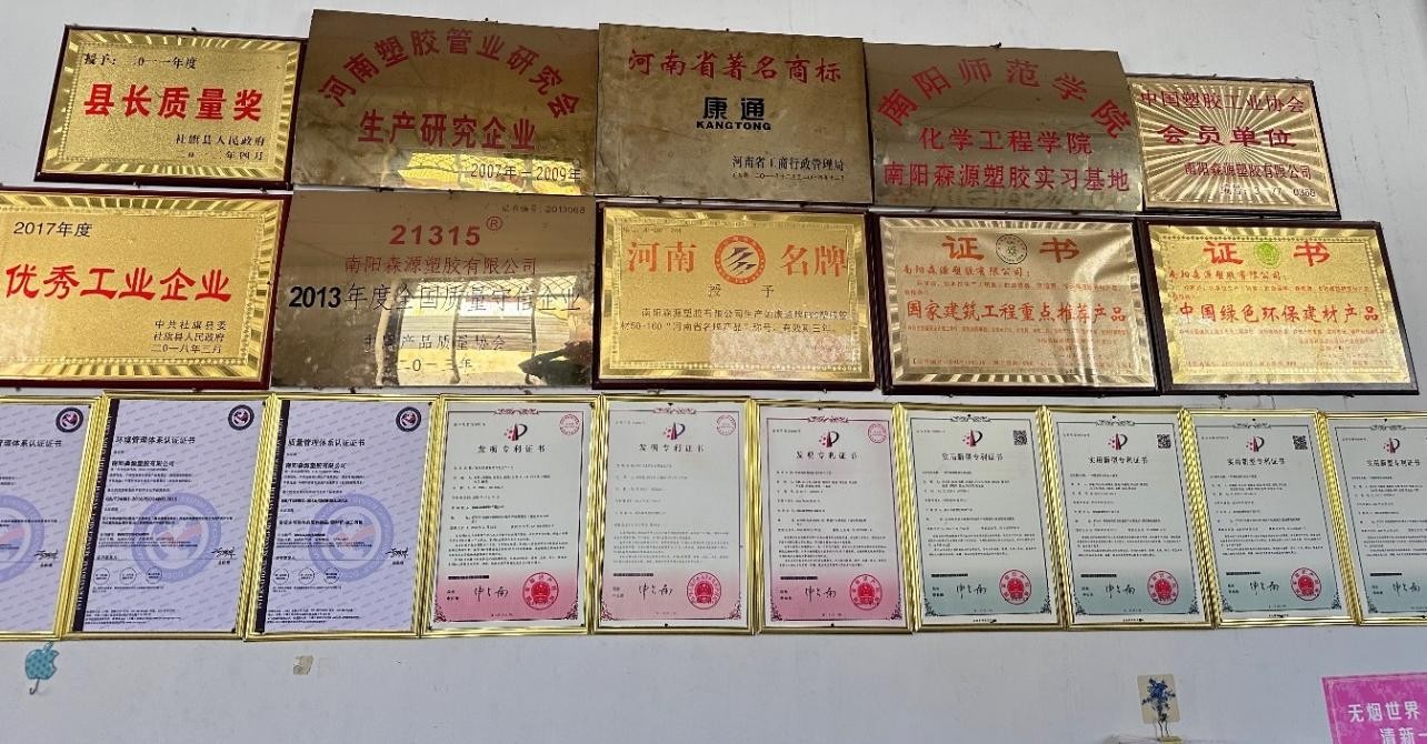 南阳森源塑胶恪守信用以顾客满意为宗旨、以科技创新为发展方针,长期坚持以质量求生存、以诚信求发展,以管理求效益,被授予河南省“守合同重信用”企业、全国塑胶管材行业质量节能环保型市场品牌,中国绿色环保建材产品、市价格诚信单位和县长质量奖等殊荣,并顺利通过IS09000、国际质量管理体系、IS014001环境管理体系和0HSAS180001职业健康管理体系认证,公司产品销售遍布全国各地,深受广大消费者的青睐。多年来公司坚持走"以质量创品牌,以品牌促发展"的企业化道路,已拥有“康通”、“常运”、“森圆”、“阳博”等自主品牌,其中“康通”品牌及其产品曾获得河南省著名商标和河南名牌产品。通过优质的产品品质和客户的高度认可,在2023年获得《品牌中国》栏目重点推荐品牌。