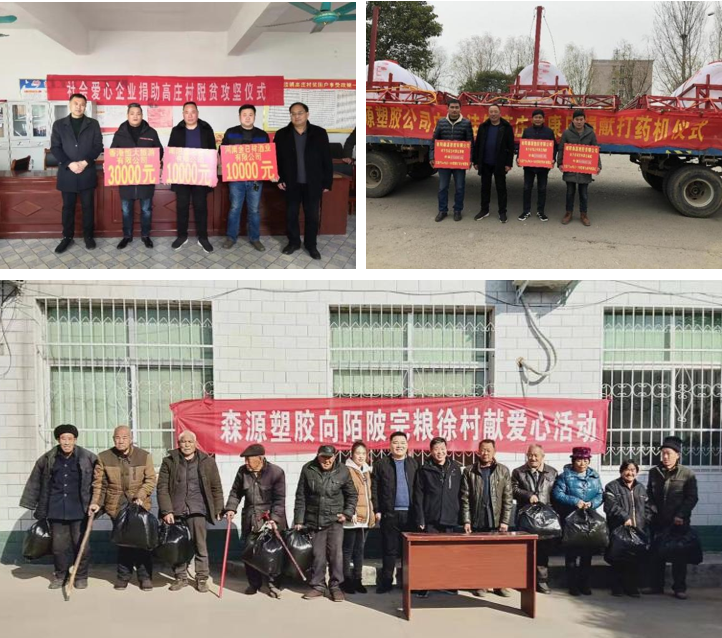 南阳森源塑胶更是一家极具社会责任感的企业,2018年企业专门成立扶贫小组,企业领导带头组织到扶贫村开展扶贫调研工作,围绕社旗县脱贫目标,以贫困村、贫困户为工作对象进行认真细致的调研,真实掌握其实际情况,结合企业的优势,对贫困村、贫困户进行帮扶工作。针对下洼乡高庄村、下洼乡闫庄村、朱集乡袁老庄村进行3WPQ-1100型牵引式喷杆喷雾机的捐赠共:16台价值507200元及现金捐赠10000元;三次向社旗县孤儿救助协会进行捐赠合计50000元。企业在捐赠的同时,并对这些贫困户进行技术指导和培训,为增加贫困户的收入打下良好基础。南阳森源塑胶力争在“同一片蓝天下”为我们的帮扶对象创造出更美好的明天。