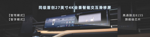 同级首创的27英寸4K全景智能交互滑移屏,画面清晰细腻,色彩还原度高。同时提供智驾模式和智享模式,在高通骁龙8155旗舰级芯片加持下,为用户带来极致流畅的沉浸式交互体验,并可以实现双人同时操作和多指快捷交互等便捷模式。