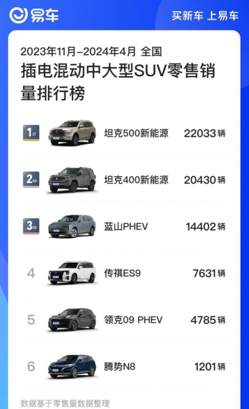正是凭借这种出色的产品力和对年轻消费者需求的精准把握,坦克400 Hi4-T在市场中大放异彩。根据易车网的最新销量排行榜,在最近半年的中大型插电混动SUV市场中,坦克400 Hi4-T以累计销量20,430辆的优异成绩荣登第二位,此成绩不仅彰显坦克400 Hi4-T强大的市场竞争力,更反映出消费者对这款车型的高度认可。