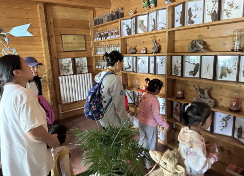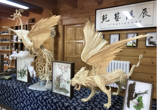 转入室内木屋,孩子们被眼前的手工艺品深深吸引。非遗工艺大师利用芦苇枝条、松果、叶片等自然材料制作的仿真昆虫和动物,以及植物编织的青龙、白虎、朱雀、玄武等神话瑞兽,让大家惊叹不已。