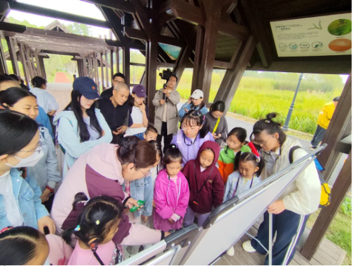 在湿地区,孩子们通过老师的实地讲解,了解了湿地水质净化的作用。随后进行的竞猜答题游戏将气氛推向高潮。孩子们分组协作,辨认刚刚学到的多种水生植物和水鸟,在趣味互动中巩固了知识。